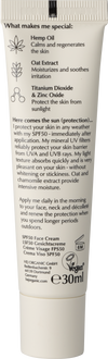 Pleťový fluid s vysokou ochranou SPF 50 nabízí jemnou péči a spolehlivou ochranu před slunečními paprsky díky minerálním filtrům, které chrání před UVA i UVB zářením. Ultra lehká textura se okamžitě vstřebává do pleti, nezanechává bílý film ani nepříjemný ulepený pocit na pokožce. Výtažek z ovsa s a konopný olej posilují kožní bariéru a zanechávají pleť zklidněnou a hebkou. Heřmánkový květinová voda zase pomáhá redukovat zarudnutí a podráždění. Fluid stačí nanést ráno jako závěrečný krok vaší rutiny.